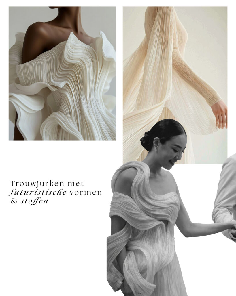 3. Gedurfd en stijlvol, maar ook extreem fotogeniek. Bepaalde structuren en stoffen kunnen jouw trouwjurk een enorm unieke look geven. Van de manier waarop de stof beweegt in de wind tot hoe het valt.